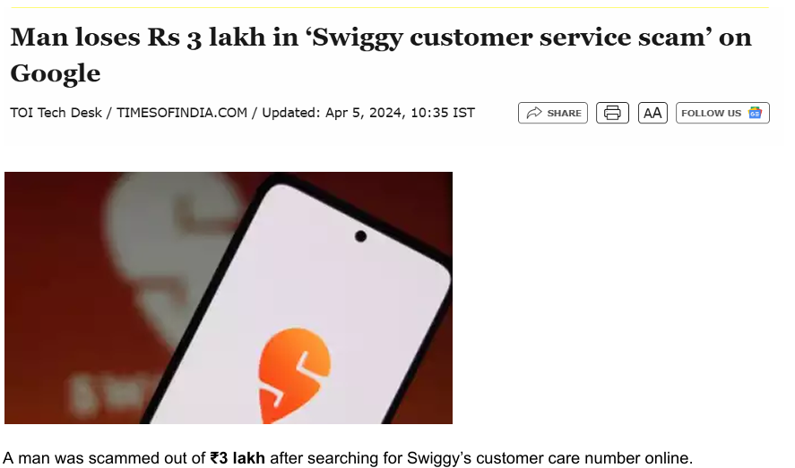 The victim searched for Swiggy’s customer care number on Google and unknowingly dialed a