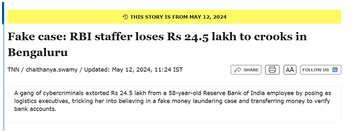 Case 4 : fake case : RBI staff loses Rs 24.5 lakh to crooks in bangalore